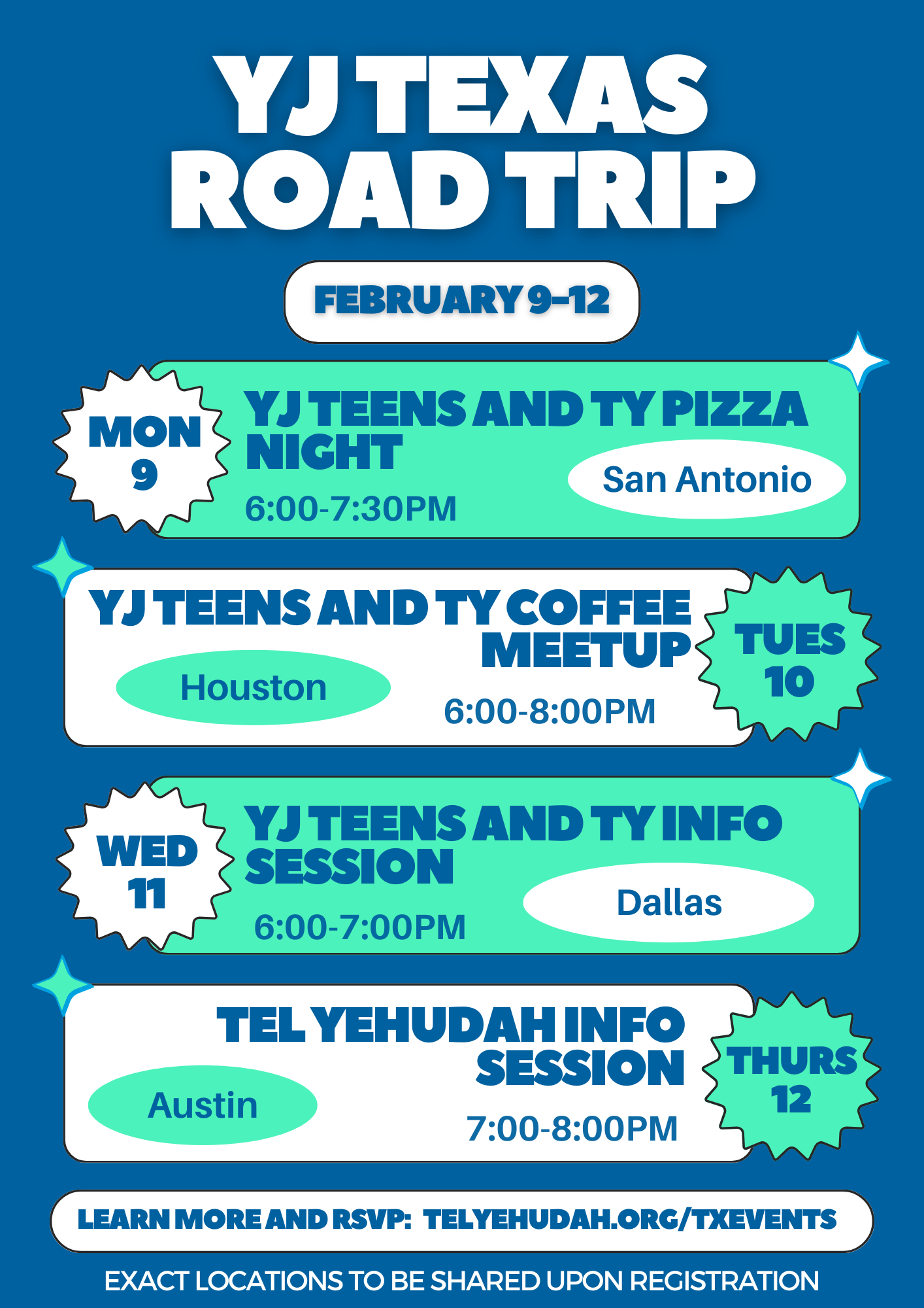 Shoutout to Texas families: Tel Yehudah and YJ Teens are heading your way! Come hang out at one of four dates and learn more about YJ’s National teen camp and our year-round teen programming!